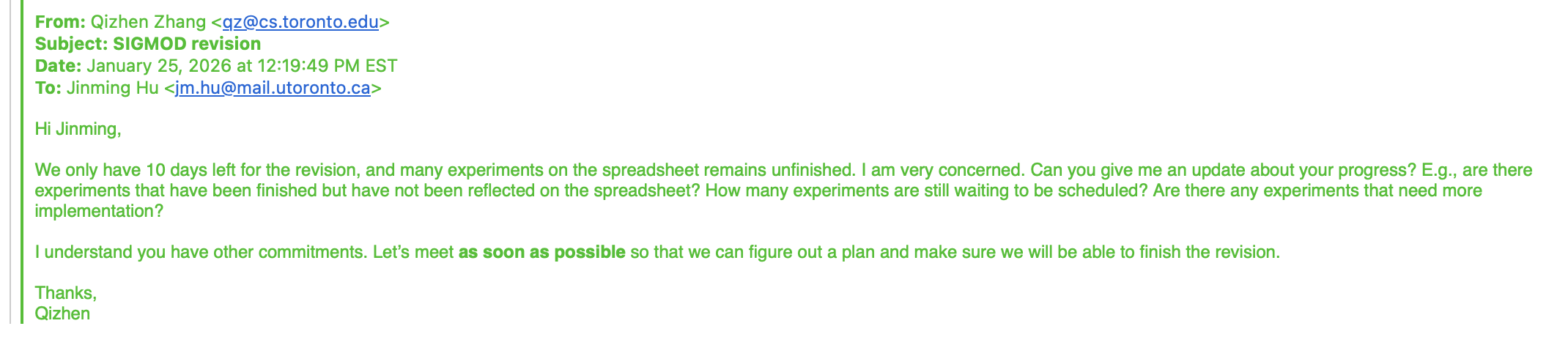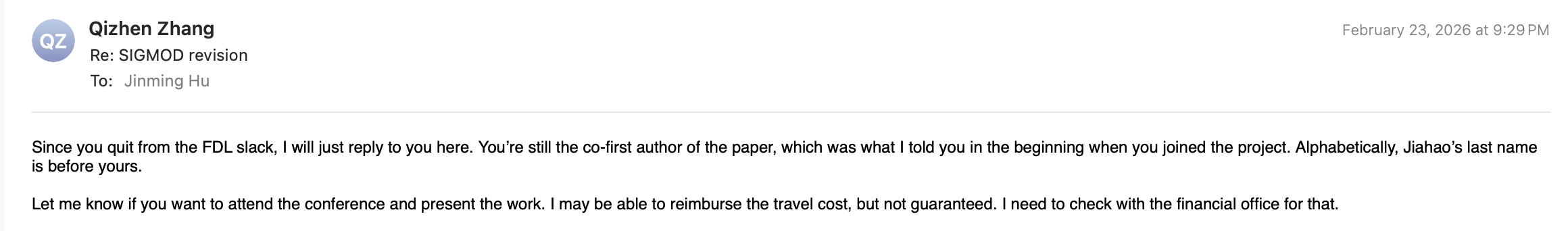 事实是即使按照诽谤文章的逻辑,JMH在该论文中的工作量也不只一多个月。 我相信很少有项目从开始到结束能在一个多月完成并被SIGMOD接收(revision尚且需要一个月)。 我们这个项目从2024年9月开始到2026年2月被接收历经了17月的时间。