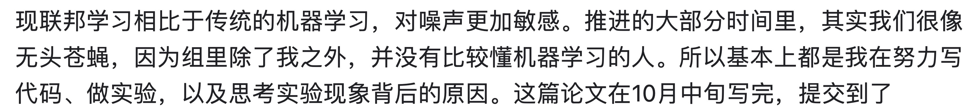 事实是除了我自己做ML and systems的工作之外,这个项目的合作者们有丰富的ML和federated learning的经验。 我们每周开组会讨论并提供建议或者具体想法。 关于data noise为什么可能对federated learning(相比传统centralized learning)有更多的影响,很多公式都是其中一个合作者推出来的。 JMH只是在submission的时候把这些公式作为补充材料上传上去了。 代码和实验也是他和JHG以及另外一名本科生共同在做。
