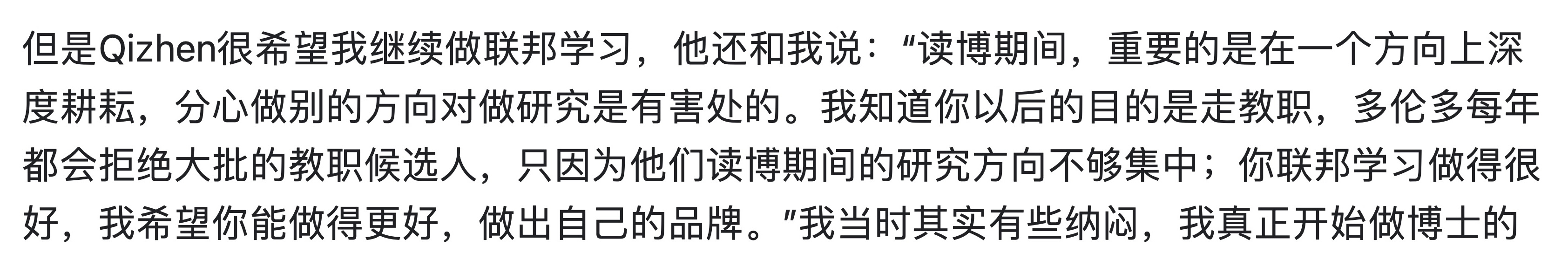 诽谤文章称我对JMH说过“读博期间,重要的是在一个方向上深度耕耘,分心做别的方向对做研究是有害处的。我知道你以后的目的是走教职,多伦多每年都会拒绝大批的教职候选人,只因为他们读博期间的研究方向不够集中;你联邦学习做得很好,我希望你能做得更好,做出自己的品牌。”: