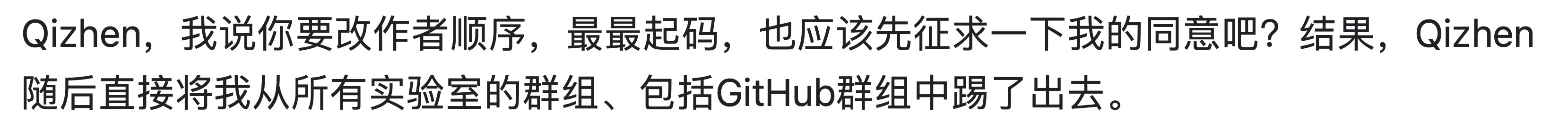 诽谤文章称“结果,Qizhen 随后直接将我从所有实验室的群组、包括GitHub群组中踢了出去”:
