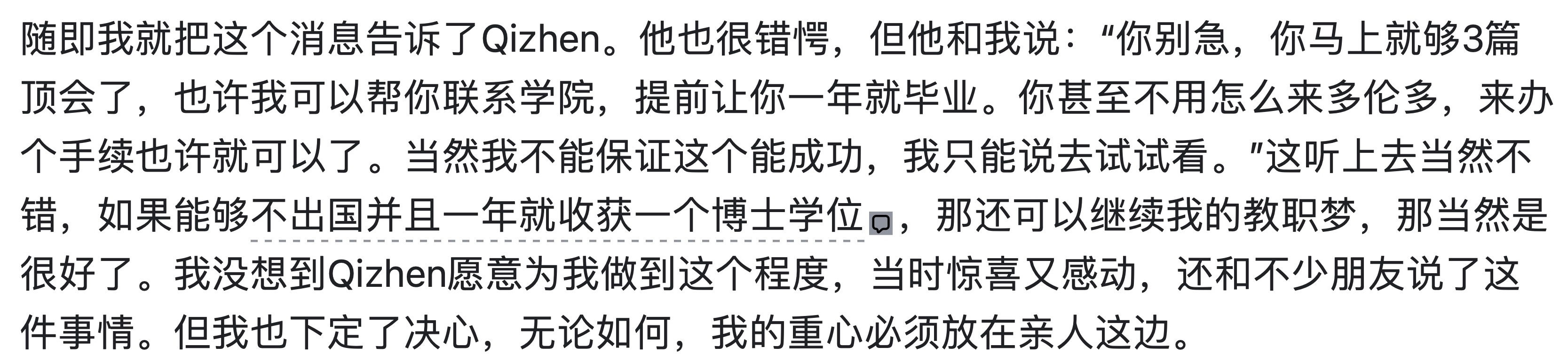 事实是JMH在告诉我他妻子生病无法来离开中国时,主动提出能不能远程读PhD。 我同情他的遭遇,也感到惋惜,所以和他讨论远程读PhD的可能性。 我想我的原话应该是我支持他远程做research,然后来Toronto一年之内上完课。 JMH否定了能离开妻子一年的可能性。 这件事情我专门询问过负责研究生的副系主任Angela Brown。 她的回答是坚决否定地,UofT不支持远程PhD。