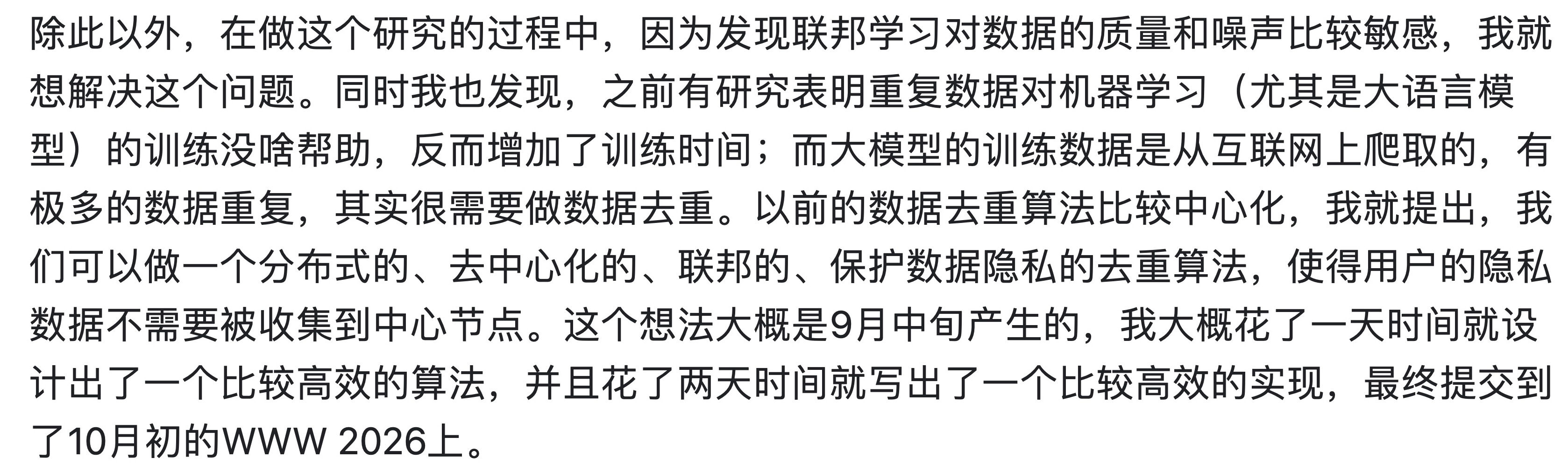 诽谤文章称JMH发现了数据重复对federated learning的影响,并提出解决方案,而且“这个想法大概是9月中旬产生的,我大概花了一天时间就设计出了一个比较高效的算法,并且花了两天时间就写出了一个比较高效的实现”: